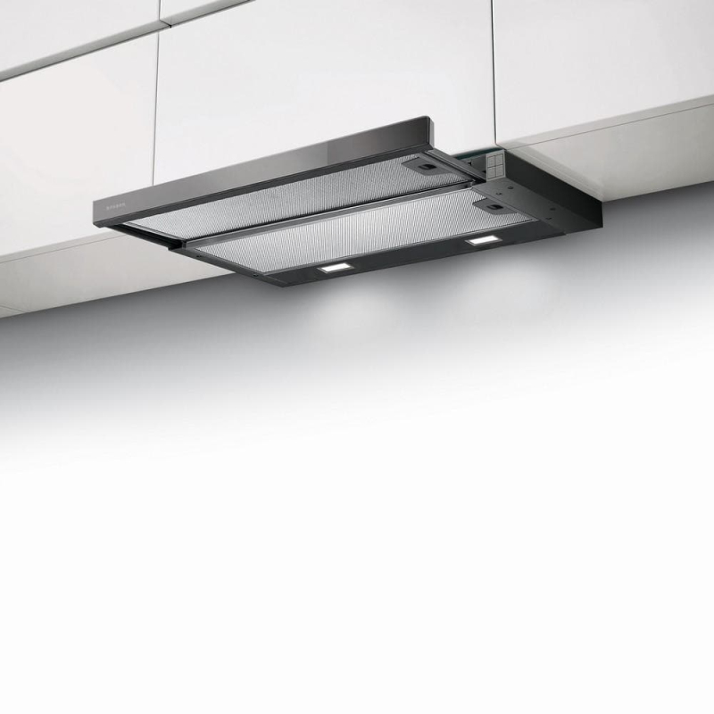 Vestavná výsuvná digestoř Faber FLEXA LUX GLASS NG BK A60 (60 cm) v černé barvě s lištou z černého skla. Spouští se při vysunutí, má 3 stupně výkonu 220–420 m³/h a hlučnost 57–69 dB. 2× LED 4000 K a kovové filtry vhodné do myčky. Odtah i recirkulace (uhlíkový filtr).