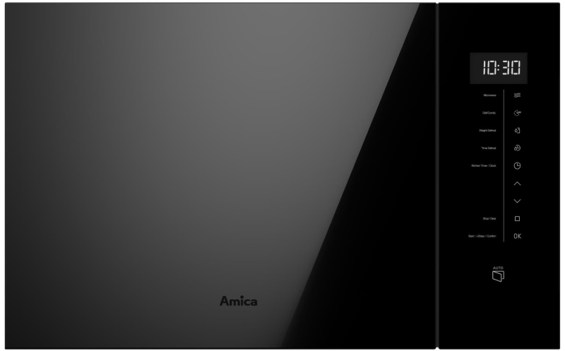 Vestavná mikrovlnná trouba Amica o šířce 59,5 cm, výšce 38,8 cm a hloubce 38,8 cm. V barevném provedení černá , spotřebič má výkon W a napájecí napětí (V): 220-240.