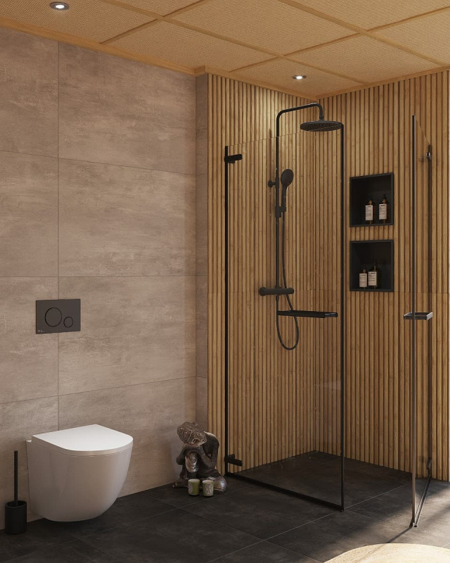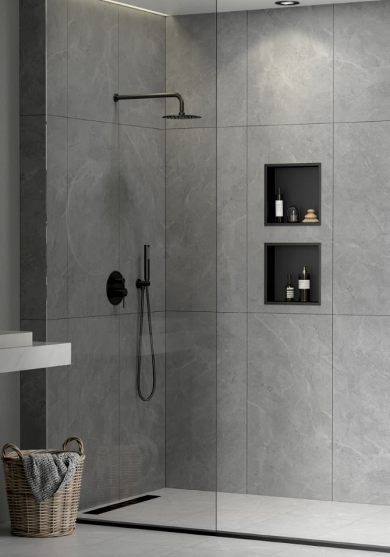 Sprchový výklenek z kvalitní nerezové oceli v černé matné barvě o velikosti 33x33 cm, hloubce 10 cm a rámem okolo výklenku.