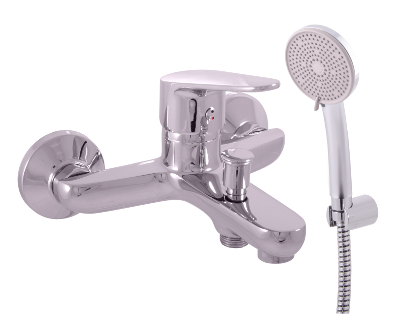 Vodovodní baterie vanová nástěnná se sprchou a pevným držákem.