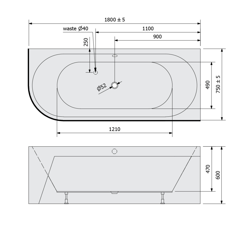 VIVA R MONOLITH asymetrická vana 180x75x60cm, šedá