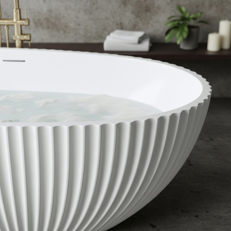 Zvolte výrazný design pro svou koupelnu s volně stojící vanou Rea Carmen. Tento model o délce 170 cm přitahuje pozornost rýhovanou texturou a moderním, lehce asymetrickým tvarem. Je vyroben z kvalitního akrylu a spojuje působivý vzhled s každodenním pohodlím při používání.Rýhovaná struktura – vnější stěny vany zdobí husté svislé drážky. Tento dekorativní vzor dodává tvaru hloubku a zároveň zachovává hladký povrch, který se snadno udržuje v čistotě.Nepravidelný ovál – Carmen se vyznačuje jemnou linií s lehce asymetrickým charakterem. Takový tvar dodává vaně lehkost a přirozený výraz a skvěle se hodí do mnoha současných interiérů.Sanitární akryl – tento materiál je mimořádně odolný a příjemně teplý při kontaktu s pokožkou, což zpomaluje chladnutí vody. Sněhově bílý povrch je jednolitý a hygienický.Kompletní montážní sada – produkt je dodáván v kompletu s dedikovaným sifonem a zátkou click-clack. Dolaďte design vany výběrem preferované barvy krytky zátky, aby dokonale ladila s vybranou armaturou a vytvořila harmonické uspořádání koupelny.Bezpečnost – model má diskrétní štěrbinový přepad, který chrání před náhodným přelitím vody a zároveň zachovává minimalistický styl výrobku.Vana Rea Carmen 170 je skvělou volbou pro ty, kteří hledají originální řešení. Její rýhovaný povrch a volná forma vnášejí do koupelny atmosféru moderního SPA salonu.