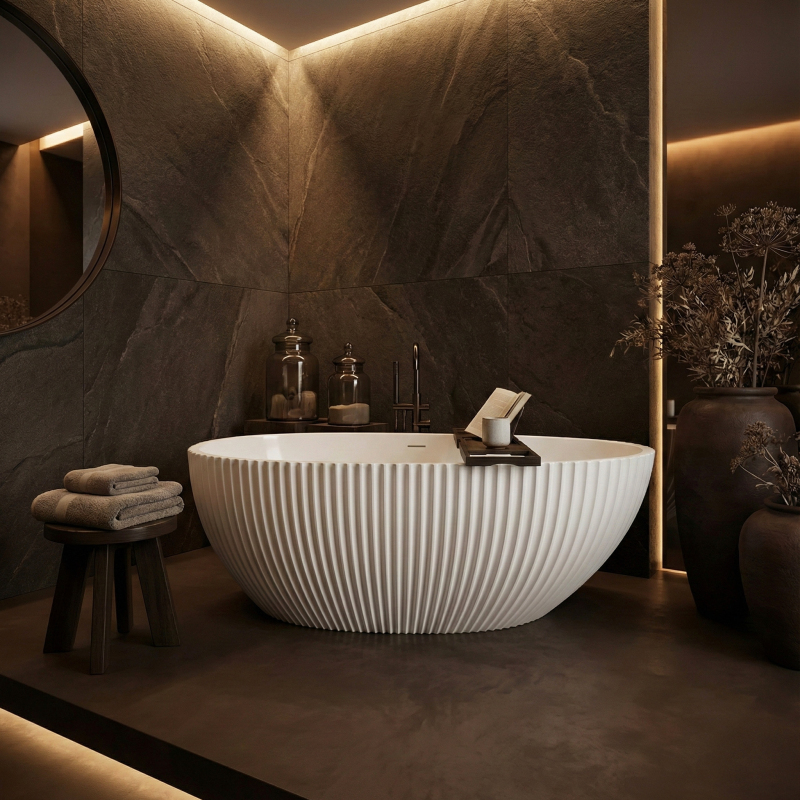 Zvolte výrazný design pro svou koupelnu s volně stojící vanou Rea Carmen. Tento model o délce 170 cm přitahuje pozornost rýhovanou texturou a moderním, lehce asymetrickým tvarem. Je vyroben z kvalitního akrylu a spojuje působivý vzhled s každodenním pohodlím při používání.Rýhovaná struktura – vnější stěny vany zdobí husté svislé drážky. Tento dekorativní vzor dodává tvaru hloubku a zároveň zachovává hladký povrch, který se snadno udržuje v čistotě.Nepravidelný ovál – Carmen se vyznačuje jemnou linií s lehce asymetrickým charakterem. Takový tvar dodává vaně lehkost a přirozený výraz a skvěle se hodí do mnoha současných interiérů.Sanitární akryl – tento materiál je mimořádně odolný a příjemně teplý při kontaktu s pokožkou, což zpomaluje chladnutí vody. Sněhově bílý povrch je jednolitý a hygienický.Kompletní montážní sada – produkt je dodáván v kompletu s dedikovaným sifonem a zátkou click-clack. Dolaďte design vany výběrem preferované barvy krytky zátky, aby dokonale ladila s vybranou armaturou a vytvořila harmonické uspořádání koupelny.Bezpečnost – model má diskrétní štěrbinový přepad, který chrání před náhodným přelitím vody a zároveň zachovává minimalistický styl výrobku.Vana Rea Carmen 170 je skvělou volbou pro ty, kteří hledají originální řešení. Její rýhovaný povrch a volná forma vnášejí do koupelny atmosféru moderního SPA salonu.