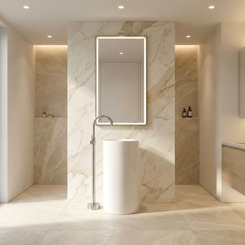 Objevte novou definici luxusu ve své mycí zóně díky podlahové umyvadlové baterii Rea Lungo. Toto mimořádně designové a funkční řešení představuje dokonalou alternativu k tradičním nástěnným či stojánkovým bateriím. Produkt byl navržen pro moderní, prostorné koupelny, kde každý detail hraje roli v konečném výsledku uspořádání.Podlahová montáž – umožňuje volné uspořádání prostoru a ideální přizpůsobení volně stojícím umyvadlům.Vysoká konstrukce – zajišťuje maximální komfort používání a volnost pohybu při každodenní hygieně.Provedení z mosazi – zaručuje dlouhou životnost, odolnost proti korozi a spolehlivý provoz.Keramická kartuše – umožňuje plynulou a přesnou regulaci proudu vody a teploty.Designový profil – štíhlá linie série Lungo dodává interiéru lehkost a podtrhuje prestižní charakter koupelny. Podlahová umyvadlová baterie Rea Lungo je volbou pro ty, kteří chtějí překročit zažité schéma a vnést do interiéru moderní nádech. Díky své jedinečné formě se skvěle hodí k volně stojícím umyvadlům a vytváří s nimi jednotný a elegantní celek. Volbou tohoto modelu Rea získáte jistotu nejvyšší kvality zpracování a výrazný dekorativní prvek, který upoutá pozornost každé návštěvy.