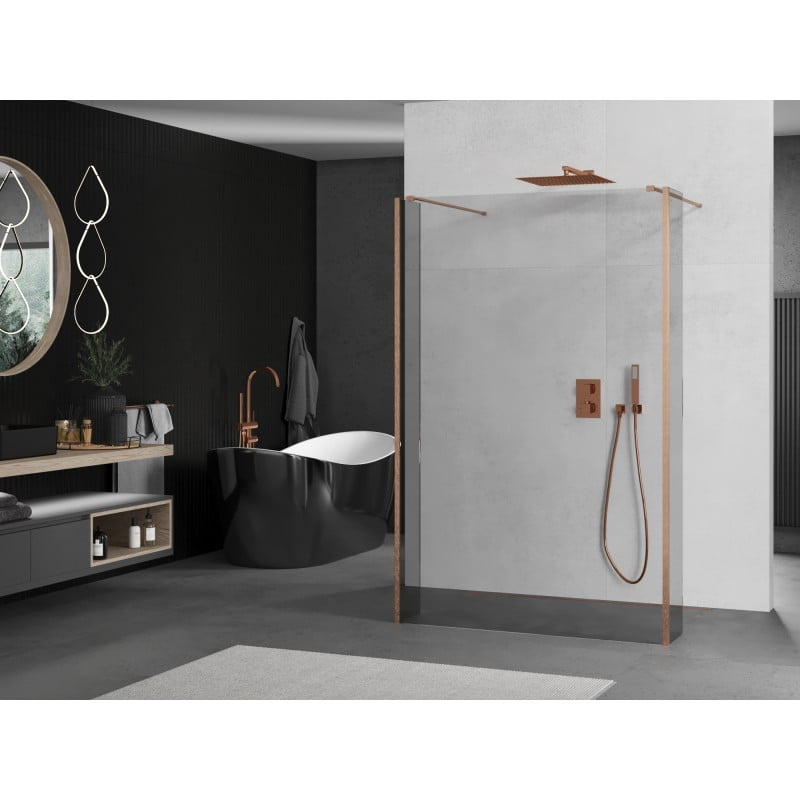 Specifikace produktu: Šířka: 110x30x30 cm (stěna X - 110 cm, stěna Y - 30 cm) Výška: 200 cm Montáž: Univerzální Barva skla: Průhledná Povrchová úprava: Kartáčovaná měď Typ skla: Tvrzené Tloušťka skla: 8 mm Profil: Hliník Konzola: Nerezová ocel Max. délka konzoly: 150 cm Konzolu lze zkrátit Povrchová úprava pro snadné čištění Vyrovnání nerovností stěny Možnost montáže na sprchovou vaničku nebo obklady