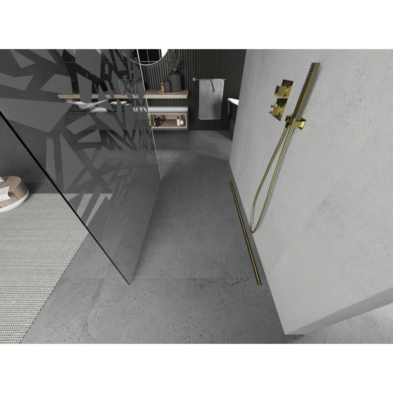 Specifikace produktu: Šířka: 130 cm Výška: 200 cm Montáž: Univerzální Barva skla: Bílý vzor Povrchová úprava: Zlatá Typ skla: Tvrzené Tloušťka skla: 8 mm Profil: Hliník Konzola: Nerezová ocel Max. délka konzoly: 150 cm Konzolu lze zkrátit Povrchová úprava pro snadné čištění Vyrovnání nerovností stěny Možnost instalace na sprchovou vaničku nebo dlaždice