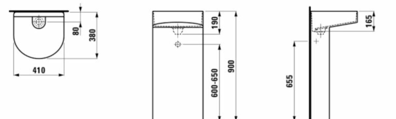 Umyvadlo bez otvoru pro baterii a přepadu o šířce 41 cm, hloubce 38 cm a výšce 90 cm. Balení bez sifonu a baterie. Montážní sada je součástí balení.