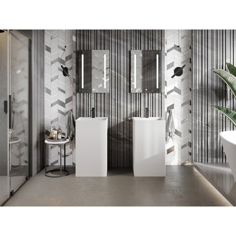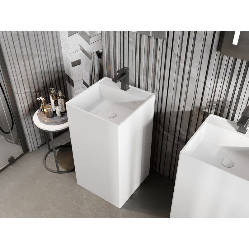 Specifikace produktu: Rozměr: 45x45x85 cm Hloubka: 13 cm Typ: Volně stojící Barva: Matná bílá Materiál: Konglomerát Otvor pro přepad: Ne Otvor pro baterii: Ano