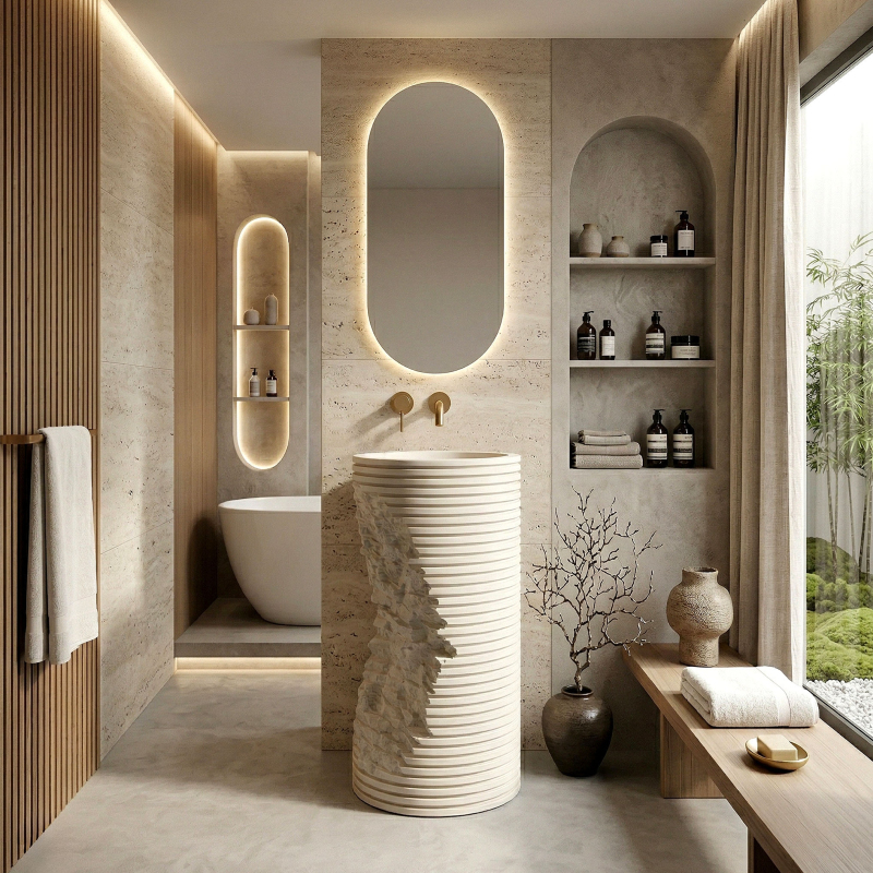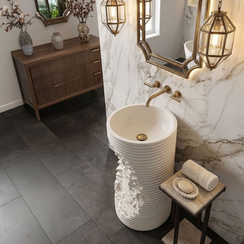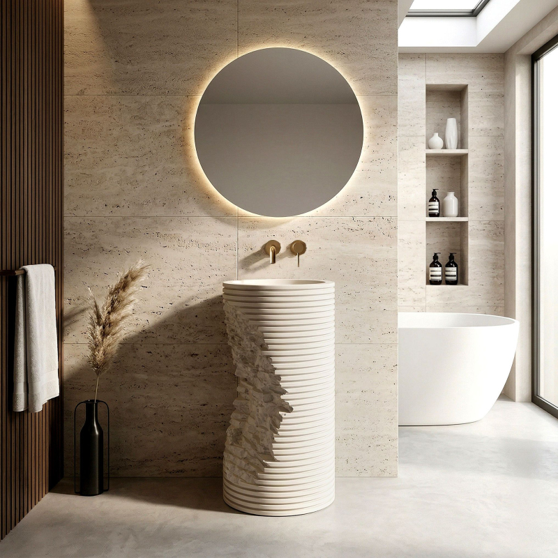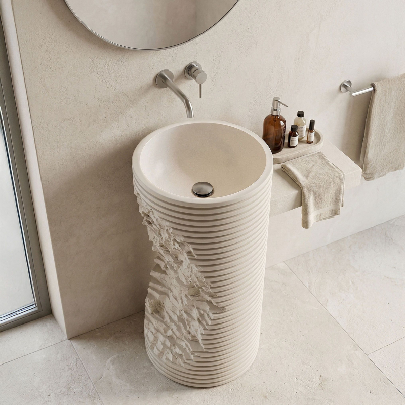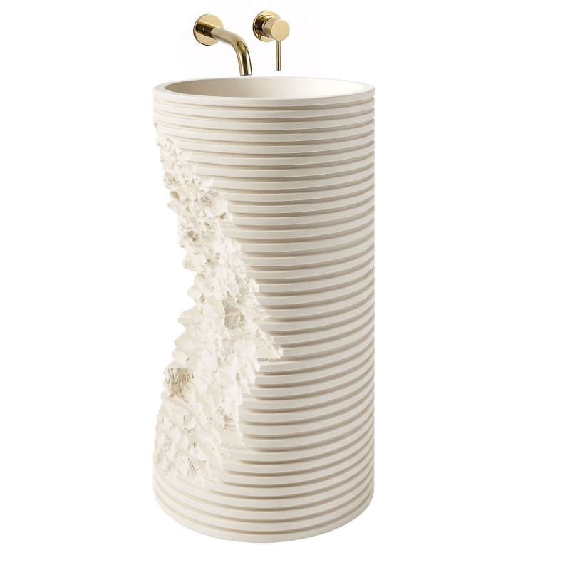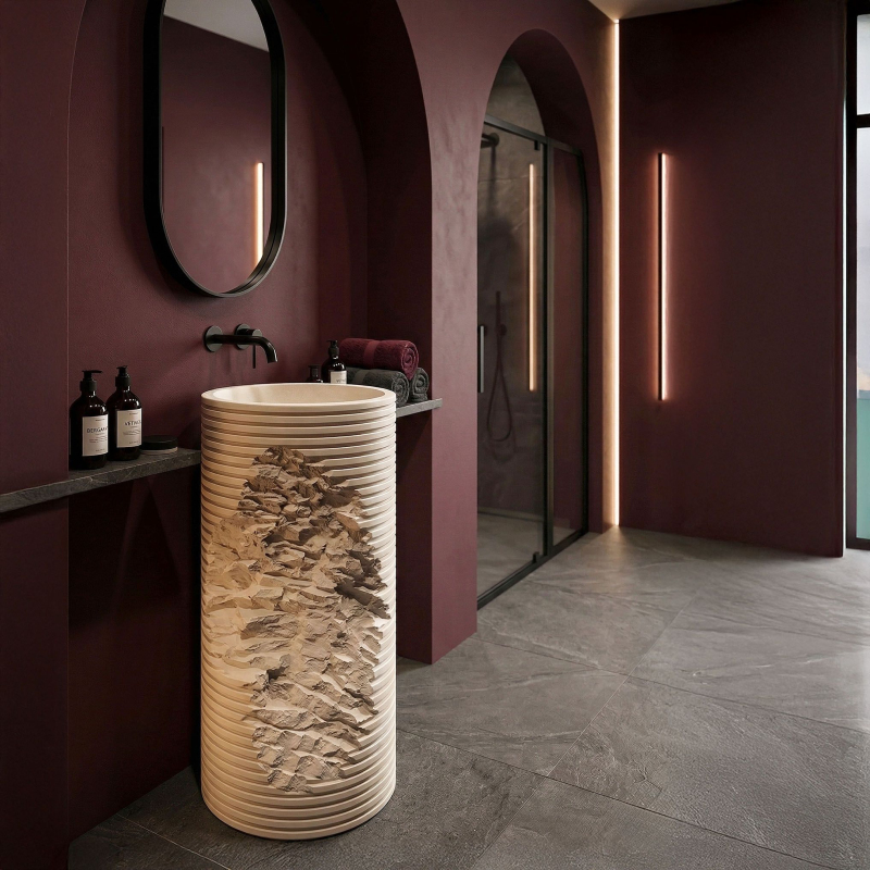 Hledáte prvek vybavení, který dodá vaší koupelně jedinečný a avantgardní charakter? Volně stojící podlahové umyvadlo Rea Travena Round je odvážným návrhem, který spojuje syrovost přírody s moderní geometrií. Je vyrobeno z kompozitu Artificial Stone a představuje nejen praktický prvek mycí zóny, ale především poutavou užitnou plastiku.Materiál Artificial Stone – použití umělého kompozitního kamene zaručuje mimořádnou odolnost, masivnost a rezistenci vůči mechanickému poškození. Tento materiál je příjemný na dotek a výborně udržuje teplotu.Unikátní architektonický design – vnější rýhovaná hmota umyvadla s kruhovým průřezem připomíná vrstveně uložené bloky. Geometrické vodorovné linie byly záměrně narušeny nepravidelným hlubokým zářezem s texturou surového, štípaného kamene, což celku dodává mimořádně originální a dynamický vzhled.Hladké kulaté vnitřní tělo – v promyšleném kontrastu k syrovému, válcovému a strukturálnímu plášti má vnitřek mísy dokonale kulatý a vyhlazený tvar. To zajišťuje volný odtok vody a činí každodenní udržování umyvadla v bezvadné čistotě velmi snadným.Promyšlená montáž (revizní otvor) – v zadní části podstavce je umístěn speciální otvor. Umožňuje pohodlné připojení sifonu a odpadní instalace a účinně skrývá veškeré technické prvky před pohledem.Podlahové umyvadlo Travena Round je ideální volbou pro milovníky netradičních řešení. Jeho surová kamenná textura a asymetrické narušení formy se skvěle hodí do koupelen ve stylu wabi-sabi, loftovém či minimalistickém a přinášejí do interiéru výrazný architektonický akcent.