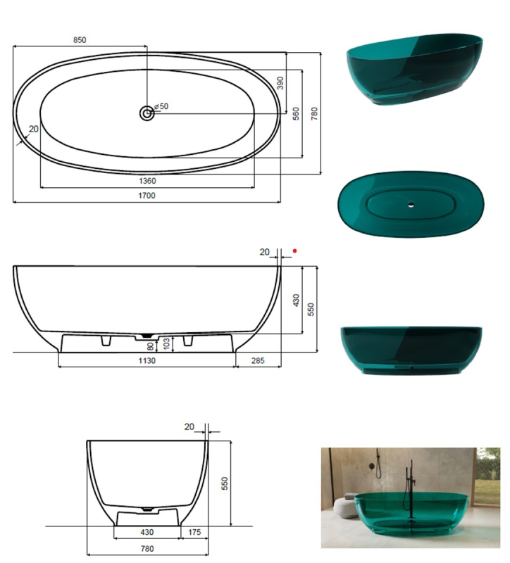- 170 × 78 cm, objem 380 l, hmotnost vany 91 kg