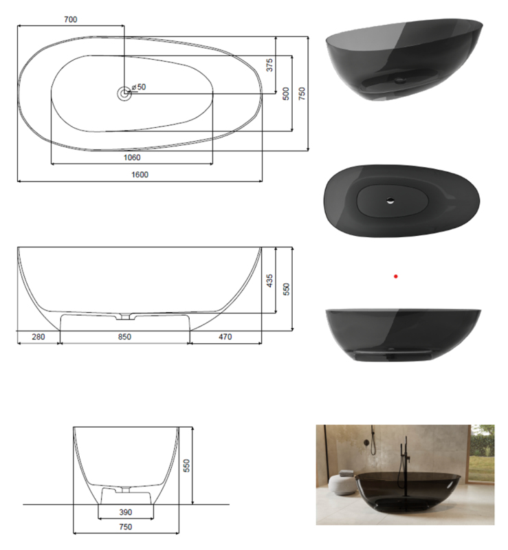 - 160 × 75 cm, objem 300 l, hmotnost vany 89 kg