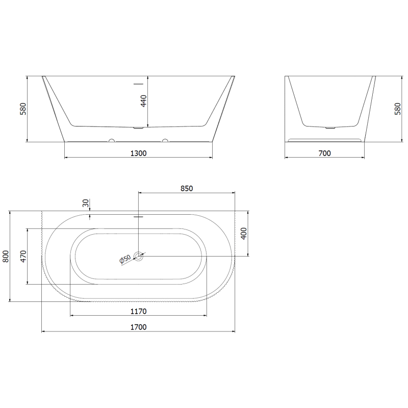 Volně stojící závěsná vana Mexen Oris s drážkovaným uzávěrem 170 x 80 cm, bílá/šedá, bílý přepad - 52871708062-20