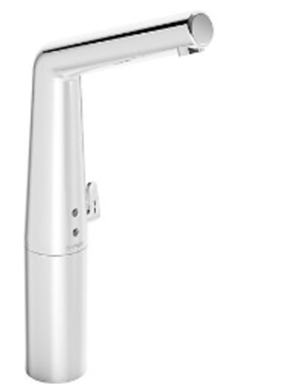 Čelní stojánková vysoká umyvadlová baterie se senzorem. V chromovém provedení. Průtok baterie je 6 litrů/minutu. Výška baterie je 35,7 cm. Ramínko je ve výšce 32,5 cm.