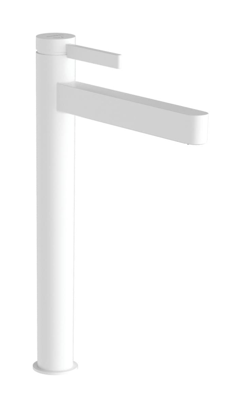 Páková stojánková vysoká umyvadlová baterie s clic-clacem v bílém matném provedení. Průtok baterie je 5 litrů/minutu. Výška baterie je 32,8 cm. Ramínko je ve výšce 26,4 cm. S matným povrchem