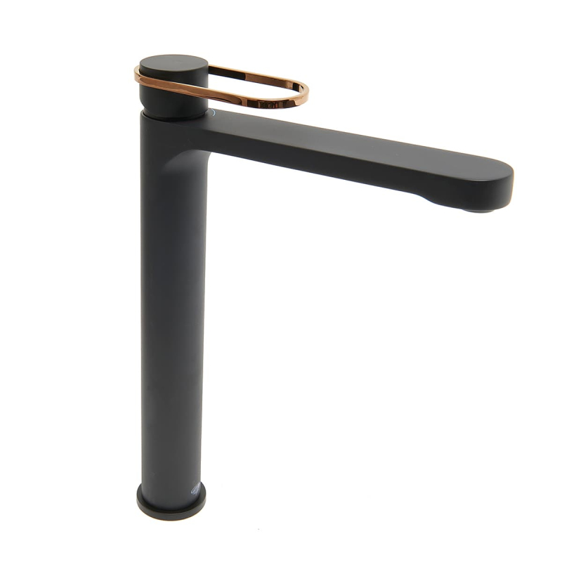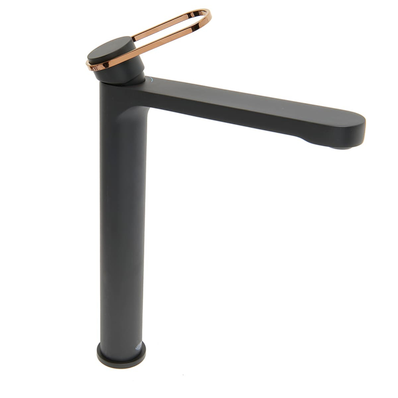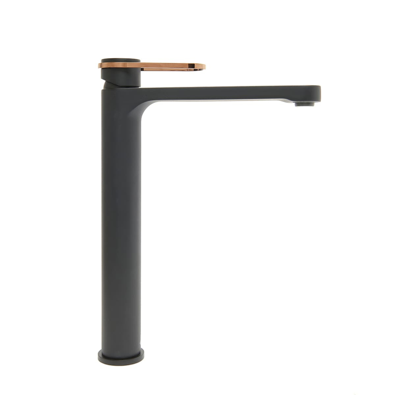 Páková stojánková vysoká umyvadlová baterie bez výpusti v barevném provedení černá/bronz.