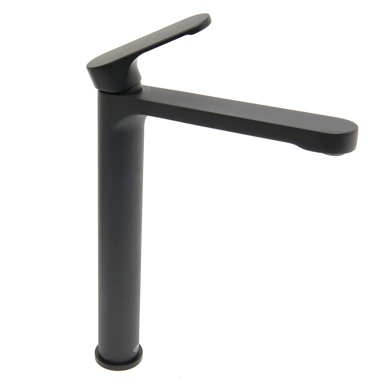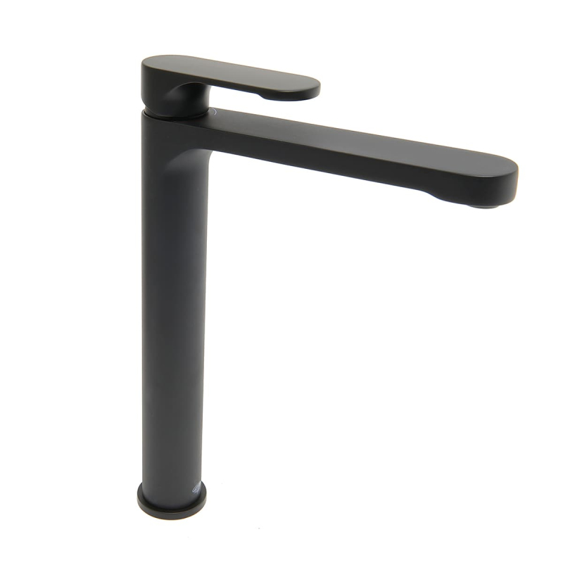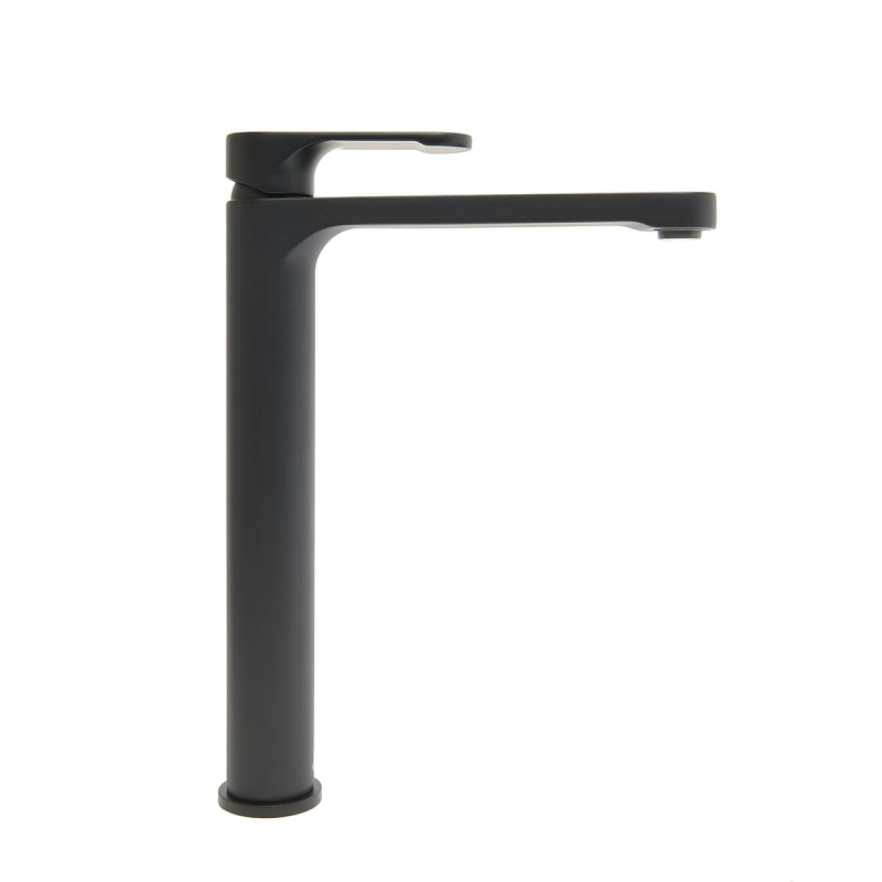 Páková stojánková vysoká umyvadlová baterie bez výpusti v černém matném provedení.