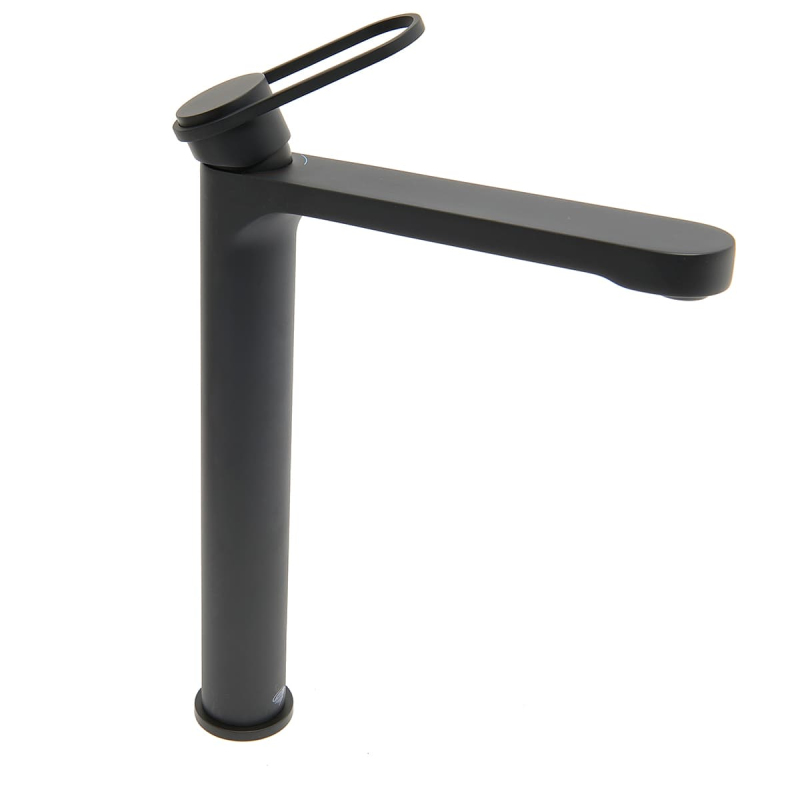 Páková stojánková vysoká umyvadlová baterie bez výpusti v černém matném provedení.