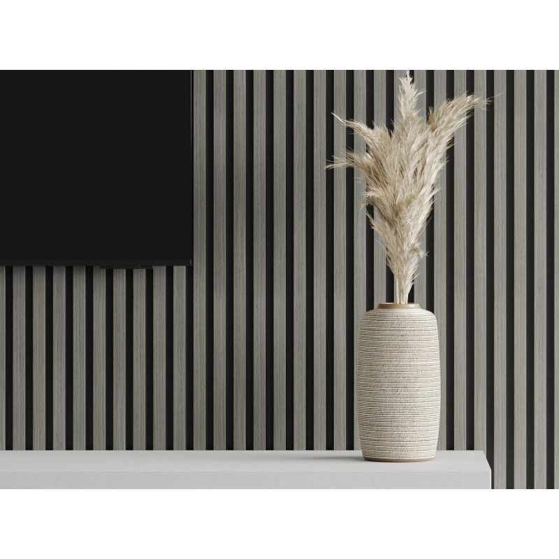 Nabídka se vztahuje na vzorek nástěnné lamely o rozměrech 15 x 15 cm. Vzorek je pouze fragmentem lamely a nepředstavuje celý vzor, vzor je rozložen na několika lamelách. Specifikace produktu: Délka: 275 cm Šířka: 30 cm Tloušťka: 2,3 cm Tloušťka podkladu: 8 mm Tloušťka jedné lamely: 15 mm Šířka jedné lamely: 30 mm Rozteč mezi lamelami: 20 mm Počet lamel: 6 Materiál lamel: MDF páska + technická dýha Podkladový materiál: Plsť Konstrukce lamel: Dub Odstín lamel: Šedý Barva podkladové vrstvy: Černá Způsob montáže: Lepením nebo šrouby Obsahuje materiály zpomalující hoření Mají akustické a zvukově izolační vlastnosti, které účinně redukují nežádoucí zvuky.