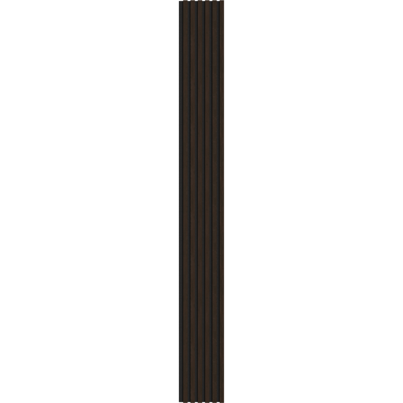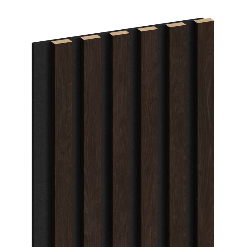 Nabídka se vztahuje na vzorek nástěnné lamely o rozměrech 15 x 15 cm. Vzorek je pouze fragmentem lamely a nepředstavuje celý vzor, vzor je rozložen na několika lamelách. Specifikace produktu: Délka: 275 cm Šířka: 30 cm Tloušťka: 2,3 cm Tloušťka podkladu: 8 mm Tloušťka jedné lamely: 15 mm Šířka jedné lamely: 30 mm Rozteč mezi lamelami: 20 mm Počet lamel: 6 Materiál lamel: MDF páska + technická dýha Podkladový materiál: Plsť Struktura lamel: Ebenová barva Odstín lamel: Hnědá Barva podkladu: Černá Způsob montáže: Lepením nebo šrouby Obsahuje materiály zpomalující hoření Mají akustické a zvukově izolační vlastnosti, které účinně redukují nežádoucí zvuky.