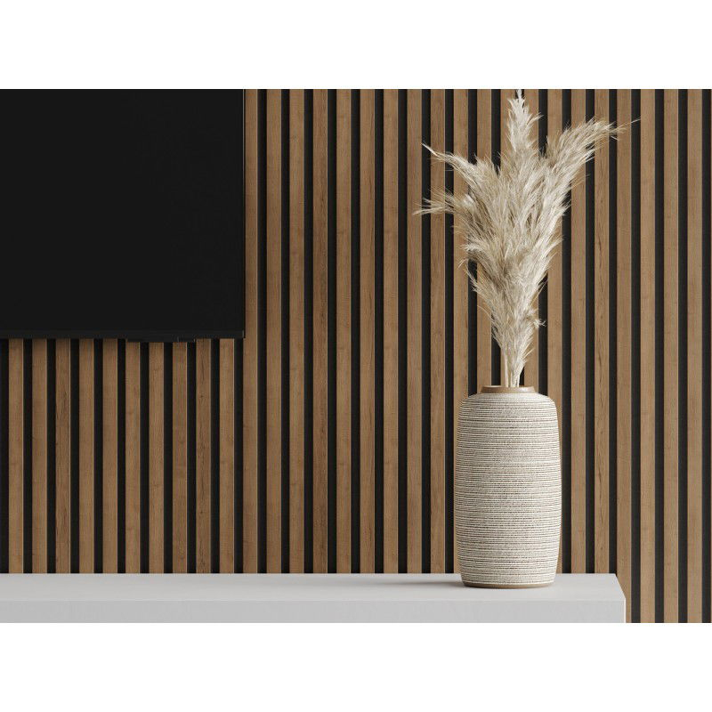 Nabídka se vztahuje na vzorek nástěnné lamely o rozměrech 15 x 15 cm. Vzorek je pouze fragmentem lamely a nepředstavuje celý vzor, vzor je rozložen na několika lamelách. Specifikace produktu: Délka: 275 cm Šířka: 31,5 cm Tloušťka: 1,9 cm Tloušťka podkladu: 6 mm Tloušťka jedné lamely: 13 mm Šířka jedné lamely: 28 mm Rozteč mezi lamelami: 18 mm Počet lamel: 7 Materiál lamel: MDF páska + melaminová dýha Podkladový materiál: Plsť Konstrukce lamel: Dub Odstín lamel: Hnědá Barva podkladu: Černá Způsob montáže: Lepením nebo šrouby Obsahuje materiály zpomalující hoření Mají akustické a zvukově izolační vlastnosti, které účinně snižují nežádoucí zvuky.