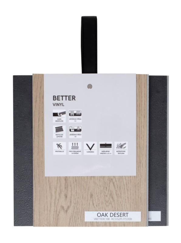 Vzorník vinylové plovoucí podlahy ze série Better. Balení obsahuje vzorek 7 dekorů. Dekory jsou stejné jak pro lepení, tak pro pokládku systémem CLICK s droplockem.