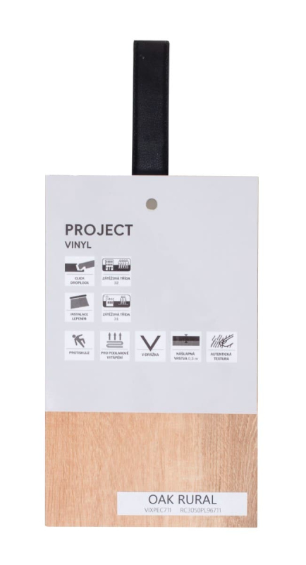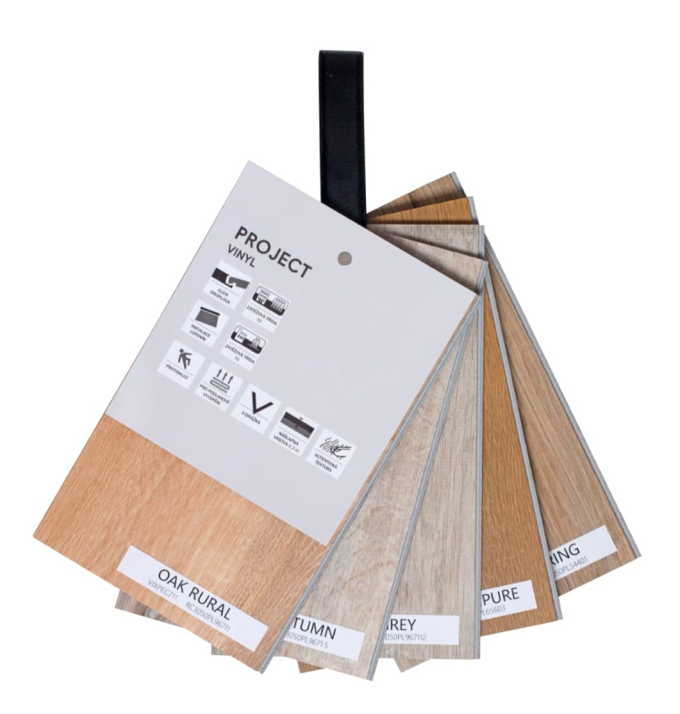 Vzorník vinylové plovoucí podlahy ze série PROJECT. Balení obsahuje vzorek 5 dekorů. Dekory jsou stejné jak pro lepení, tak pro pokládku systémem CLICK s droplockem.