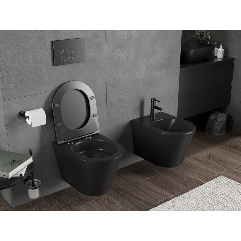 Specifikace produktu: Rozměr: 49x36x37 cm Montáž: Závěsná Splachování: Bez okraje Tornado Barva: Matná černá Materiál: Sanitární keramika Typ sedátka: S pomalým dovíráním Barva: Matná černá Materiál: Duroplast Tenké provedení: Ano Snadné uvolnění: Ano Kovové panty: Ano