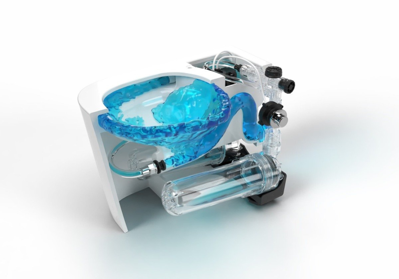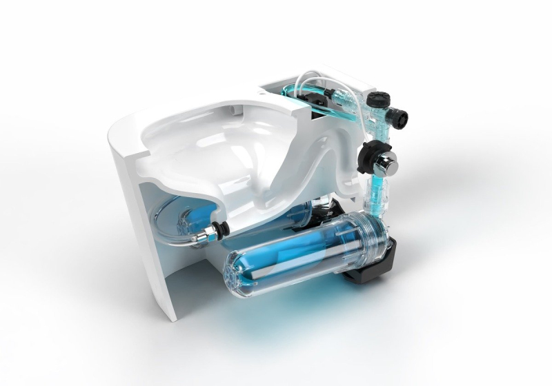 WC nepotřebuje podomítkovou nádržku ve zdi, ani zdroj externí energie, vše je uvnitř. Využívá vlastnosti stlačeného vzduchu, který se akumuluje tlakem z vodovodního řadu.