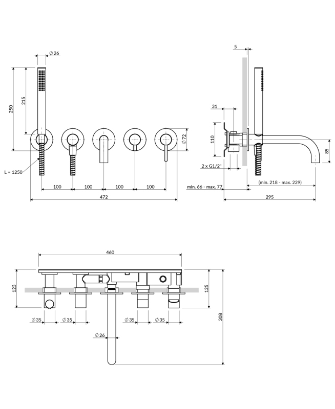 Omnires Y pět otvorová podomítková vanová baterie s hubicí, kartáčo grafit Y1237-1GR