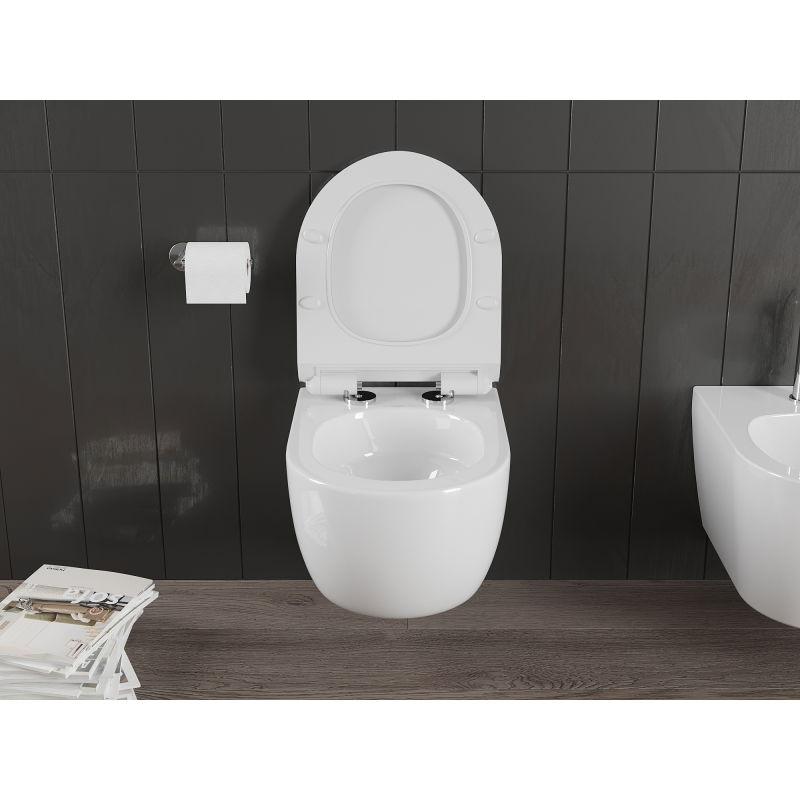 Specifikace produktu: Rozměr: 49x36,5x34 cm Instalace: Závěsná Splachování: Bez okraje Tornado Barva: Lesklá bílá Materiál: Sanitární keramika Typ sedátka: S pomalým dovíráním Barva: Lesklá bílá Materiál: Duroplast Tenké provedení: Ano Snadné uvolnění: Ano Kovové panty: Ano