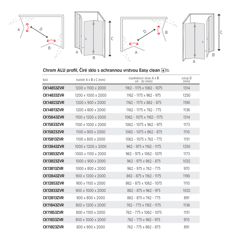 Hliníkové profily v barvě chrom, sklo Čiré, síla skla 6/6 mm, obdélník, rozměr 1000x900 mm, výška 2000 mm, vstup rohem.. Zobrazit více