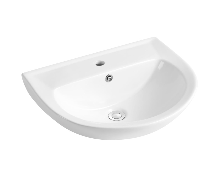 Závěsné keramické umyvadlo v bílé barvě se šířkou 56,5 cm, hloubkou 44 cm a výškou 18 cm. Balení bez baterie, vtoku a sifonu.
