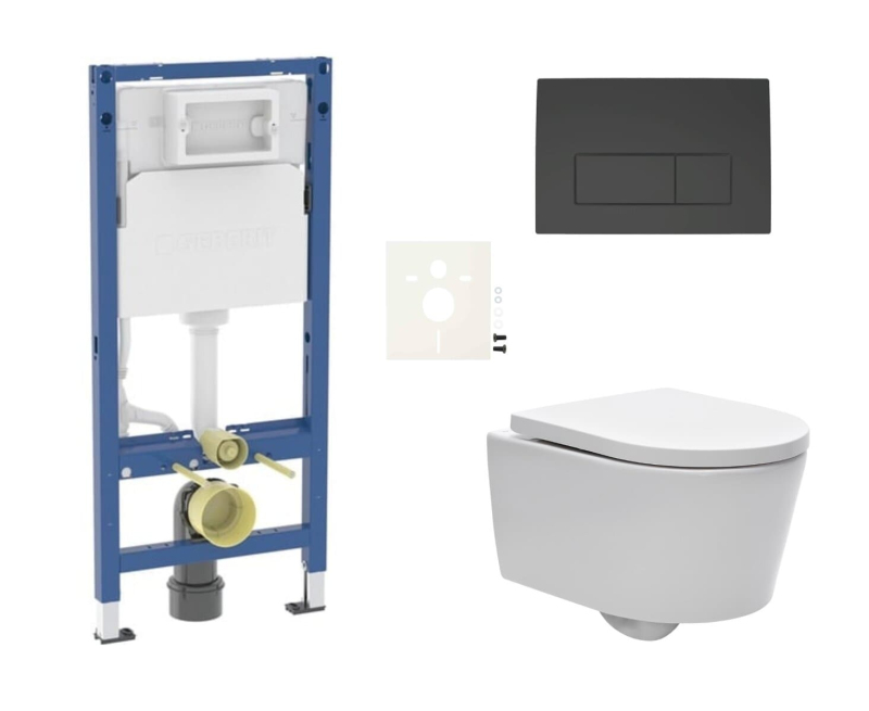 Závěsný WC set - sada obsahuje Geberit modul do lehkých stěn / předstěnová, ovládací tlačítko Delta, WC a WC sedátko. WC prkénko je vyrobeno z materiálu duroplast. Ovládací tlačítko je z materiálu plast, a je v barevném provedení černá matná.