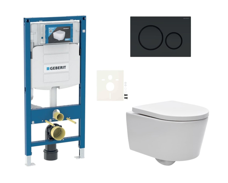Závěsný WC set - sada obsahuje Geberit modul do lehkých stěn / předstěnová, ovládací tlačítko Sigma, WC a WC sedátko. WC prkénko je vyrobeno z materiálu duroplast. Ovládací tlačítko je z materiálu plast, a je v barevném provedení černá matná.