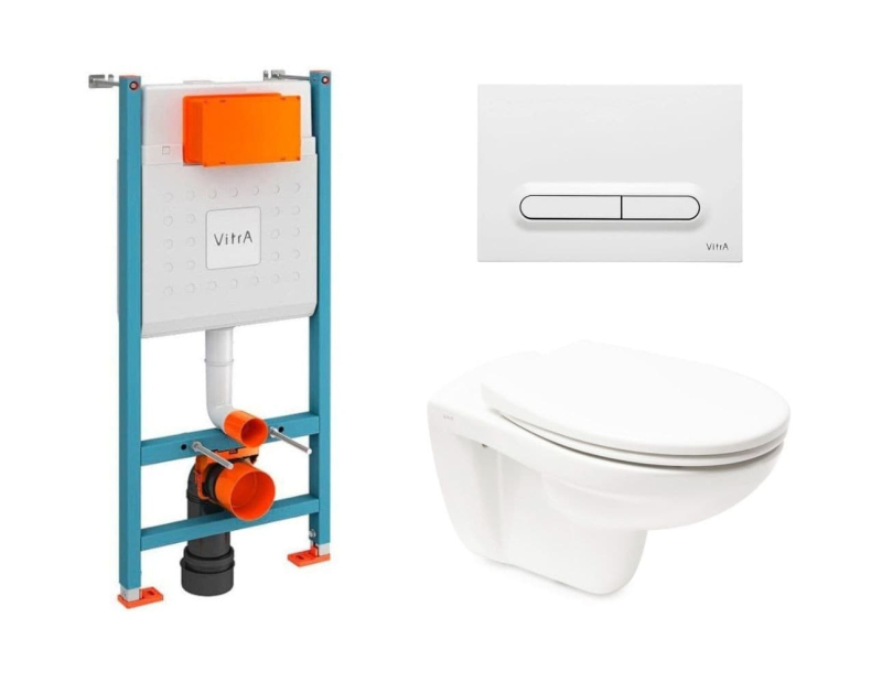 Závěsný wc set - sada obsahuje Vitra modul do lehkých stěn / předstěnová,a WC sedátko. WC prkénko je vyrobeno z materiálu thermoplast. Ovládací tlačítko je z materiálu plast, a je v barevném provedení Bílá lesk.