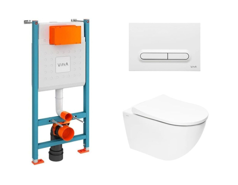 Závěsný wc set - sada obsahuje Vitra modul do lehkých stěn / předstěnová,a WC sedátko. WC prkénko je vyrobeno z materiálu duroplast. Ovládací tlačítko je z materiálu plast, a je v barevném provedení Bílá lesk.