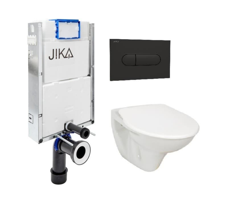 Závěsný wc set - sada obsahuje: Jika modul k zazdění, WC sedátko. WC prkénko je vyrobeno z materiálu thermoplast. Ovládací tlačítko je z materiálu plast, a je v barevném provedení černá matná.