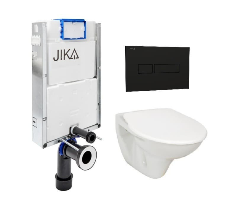 Závěsný wc set - sada obsahuje: Jika modul k zazdění, WC sedátko. WC prkénko je vyrobeno z materiálu thermoplast. Ovládací tlačítko je z materiálu plast, a je v barevném provedení černá matná.