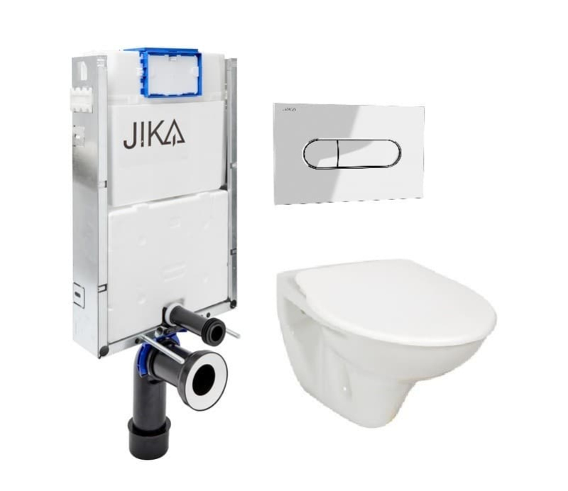 Závěsný wc set - sada obsahuje: Jika modul k zazdění, WC sedátko. WC prkénko je vyrobeno z materiálu thermoplast. Ovládací tlačítko je z materiálu plast, a je v barevném provedení chrom lesklý.
