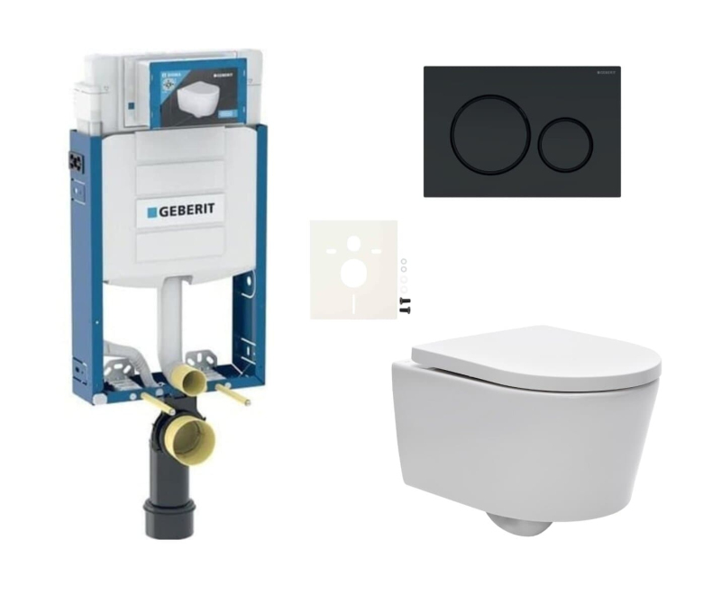 Závěsný WC set - sada obsahuje Geberit modul k zazdění, ovládací tlačítko Sigma, WC a WC sedátko. WC prkénko je vyrobeno z materiálu duroplast. Ovládací tlačítko je z materiálu plast, a je v barevném provedení černá matná.
