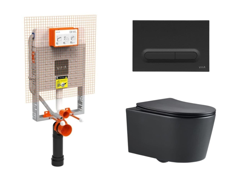 Závěsný wc set - sada obsahuje Vitra modul k zazdění,a WC sedátko. WC prkénko je vyrobeno z materiálu duroplast. Ovládací tlačítko je z materiálu plast, a je v barevném provedení černá matná.