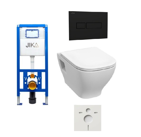 Závěsný WC set - sada obsahuje Jika modul do předstěnové montáže, WC a WC sedátko. WC prkénko je vyrobeno z materiálu duroplast. Ovládací tlačítko je z materiálu plast, a je v barevném provedení černá matná.