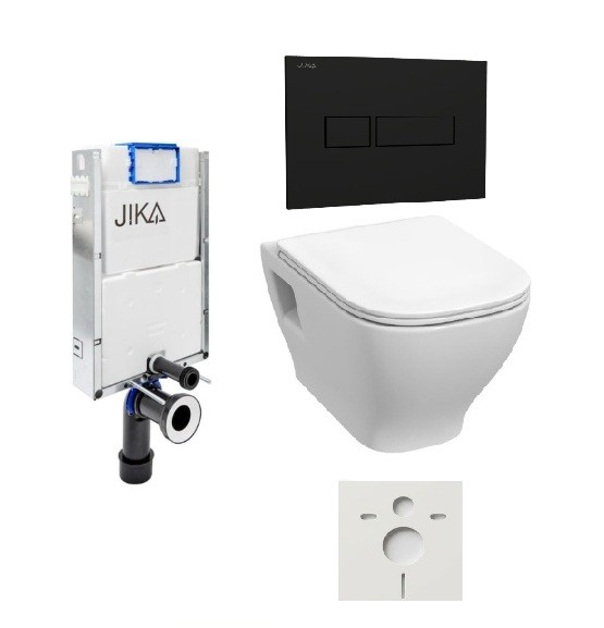 Závěsný WC set - sada obsahuje Jika modul do předstěnové montáže, WC a WC sedátko. WC prkénko je vyrobeno z materiálu duroplast. Ovládací tlačítko je z materiálu plast, a je v barevném provedení černá matná.