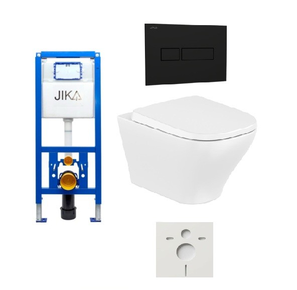 Závěsný WC set - sada obsahuje Jika modul do předstěnové montáže, WC a WC sedátko. WC prkénko je vyrobeno z materiálu duroplast. Ovládací tlačítko je z materiálu plast, a je v barevném provedení černá matná.