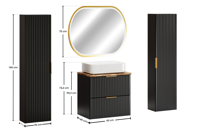 Zestaw meblowy 60cm z blatem, umywalką nablatową Magic, szafkami wysokimi i lustrem LED