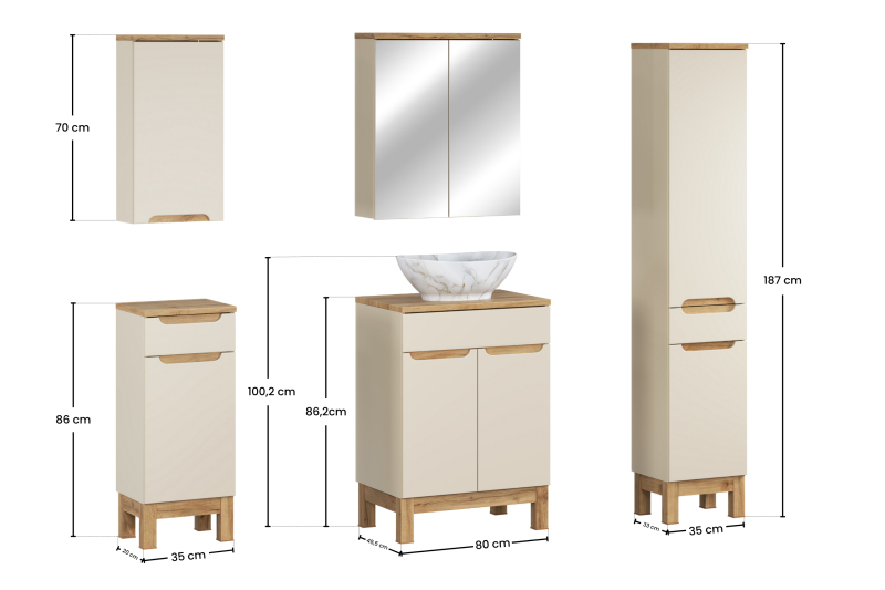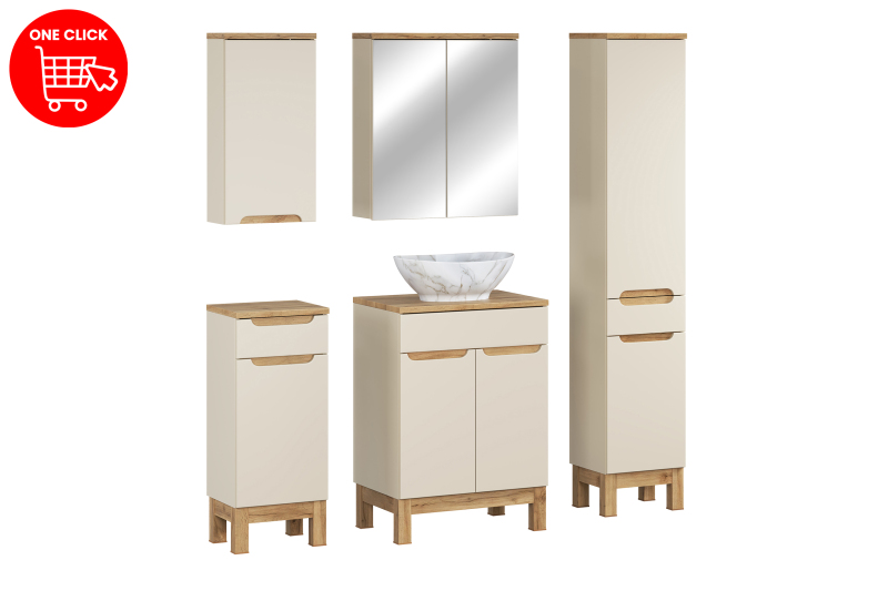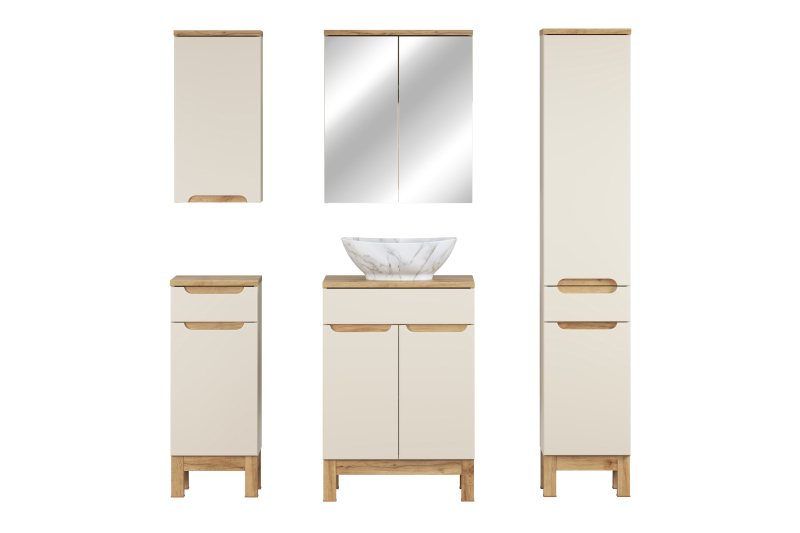 Zestaw meblowy 60cm z blatem, umywalką nablatową Pati, szafką wysoką i szafką z lustrem
