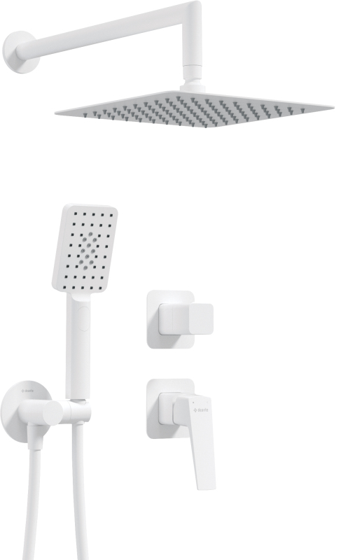 Elegancki zestaw podtynkowy składający się głowicy, słuchawki prysznicowej wraz przyłączem kątowym i wężem oraz baterii. Głowica natryskowa w kwadratowym kształcie zapewnia równomierny, komfortowy strumień wody, gwarantując relaksujące doznania podczas kąpieli. Wykonana z wysokiej jakości materiałów, jest trwała i odporna na korozję. Zestaw wyposażony jest również w baterię podtynkową z ergonomiczną dźwignią, która umożliwia precyzyjną regulację temperatury i natężenia strumienia wody. Całość wykończona w matowej bieli, która idealnie komponuje się zarówno z nowoczesnymi, jak i klasycznymi aranżacjami łazienkowymi. Dzięki podtynkowej konstrukcji, elementy instalacji są dyskretnie ukryte, co nadaje łazience minimalistyczny i schludny wygląd.