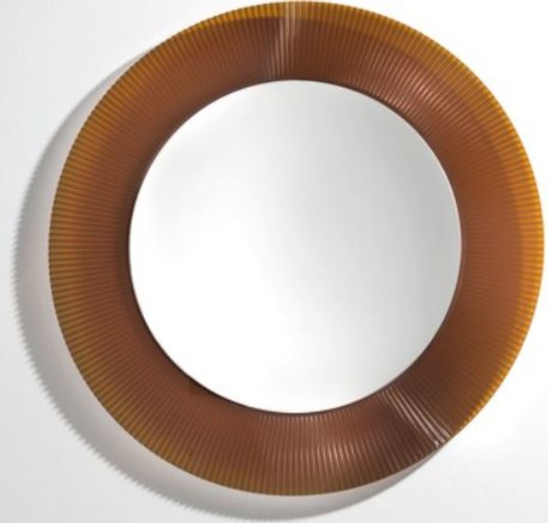 Kulaté zrcadlo o průměru 78 cm. Rám zrcadla v oranžové barvě.