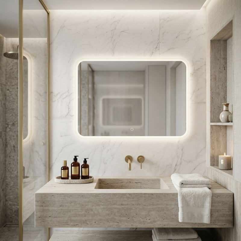 Proměňte interiér své koupelny a získejte každodenní komfort díky našemu nástěnnému LED zrcadlu Rea 80×60 cm s mléčným rámečkem. Je to ideální spojení moderního stylu a inovativní funkčnosti, které nadchne každého člena domácnosti. Toto obdélníkové zrcadlo s jemně zaoblenými rohy, vyrobené z kvalitních materiálů, nejen opticky zvětší prostor, ale také zajistí dokonalé osvětlení každý den.Obdélníkový tvar se zaoblenými rohy se skvěle hodí k nejnovějším trendům, zjemňuje ostré linie armatur a dodává interiéru moderní eleganci.Mléčný LED rámeček o šířce přibližně 3 cm krásně rozptyluje světlo a mimořádně tenká plocha o tloušťce 3 mm zaručuje minimalistický a jemný vzhled na stěně.LED osvětlení s neutrální barvou světla zajišťuje přirozené podání barev, což je velmi užitečné při ranním líčení nebo přesném holení.Intuitivní dotykové tlačítko s funkcí stmívání umožňuje rychlé zapnutí a plynulou regulaci jasu, čímž pomáhá vytvořit relaxační atmosféru v koupelně při večerní koupeli.Praktický kabel se zástrčkou zaručuje bezproblémovou a rychlou montáž a umožňuje okamžité používání zrcadla bez úprav domácí elektroinstalace.Koupelnové LED zrcadlo Rea je spolehlivou volbou pro ty, kteří si cení pohodlného používání a promyšleného designu. Díky pevnému zpracování a úsporné technologii si můžete být jisti, že vám bude sloužit po mnoho let.