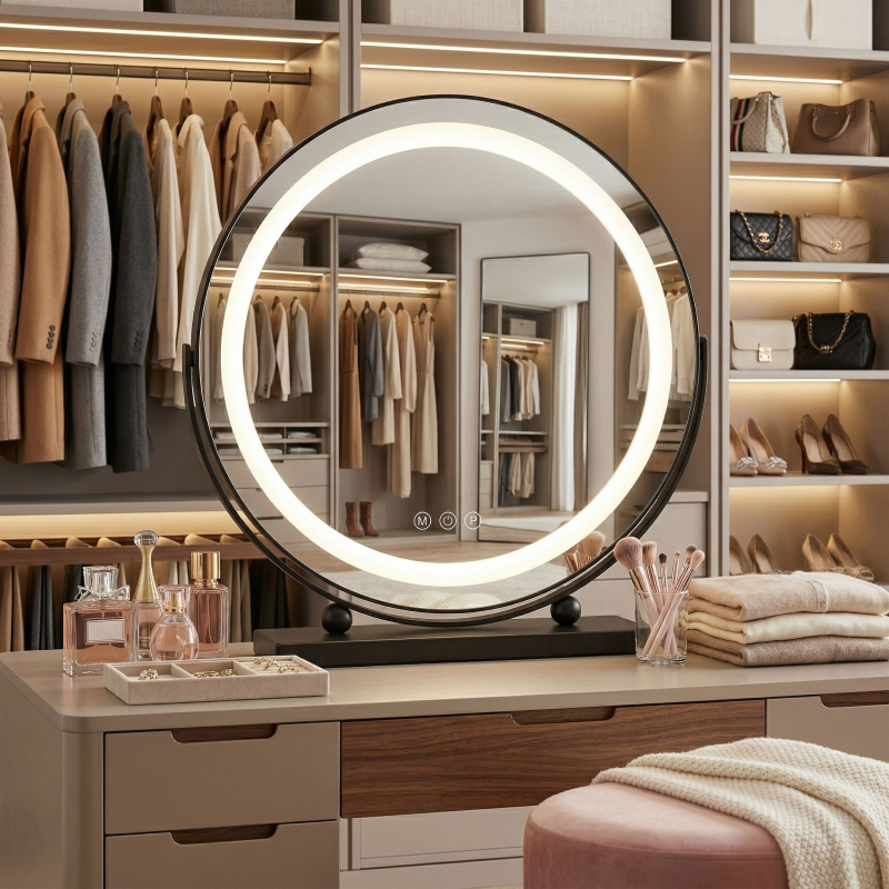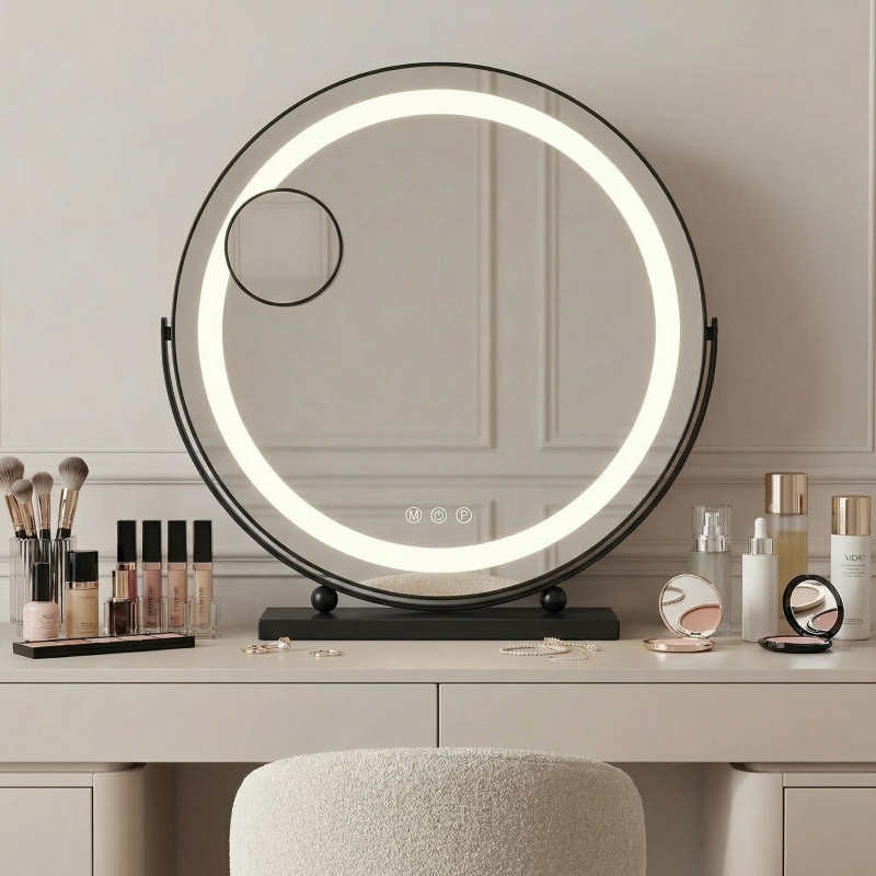 Oceňte profesionalitu a moderní design ve svém beauty koutku díky kosmetickému LED zrcadlu Make-Up Black o průměru 40 cm. Je to ideální spojení stylu a funkčnosti, které nadchne každého, kdo hledá perfektní osvětlení pro každodenní péči a líčení. Zrcadlo vyrobené z nejlepších materiálů v hlubokém černém provedení nejen podtrhne vzhled vašeho toaletního stolku, ale zajistí také spolehlivost a komfort používání každý den.Pohyblivá konstrukce plochy – možnost svobodné regulace úhlu sklonu na stabilní nožce umožňuje ideálně přizpůsobit polohu zrcadla vašim potřebám.Tři barvy podsvícení – výběr mezi teplým, studeným a neutrálním odstínem umožňuje perfektní sladění světla s denní dobou a typem prováděného líčení.Funkcja stmívání a rozjasňování – inteligentní regulace intenzity jasu umožňuje vytvořit optimální podmínky pro práci a zároveň chrání zrak před únavou.Intuitivní dotykové ovládání – tři diskrétní senzory umístěné přímo v ploše skla zajišťují okamžitou a jednoduchou obsluhu všech funkcí jedním dotykem.Speciální napájecí adaptér v balení – stálé síťové napájení zaručuje neměnný výkon svícení LED diod bez nutności používat baterie.Elegantní černé provedení – minimalistické pouzdro a solidní základna v matné černé barvě zajišťují, že zrcadlo dokonale zapadá do moderních a loftových interiérů. Kosmetické LED zrcadlo Make-Up Black je volbou pro lidi, kteří si cení luxusu a moderního designu v pohodlí domova. Perfektní v každém detailu, vyrobené s důrazem na kvalitu a estetiku, bude výraznou ozdobou vašeho interiéru. Díky mobilní konstrukci a pokročilému systému osvětlení si můžete být jisti, že každé líčení proběhne v profesionálních podmínkách.